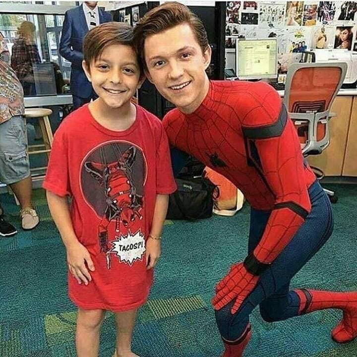4. ฮีโร่ขวัญใจเด็กๆ อย่างสไปเดอร์แมนก็มาให้กำลังใจเด็กเหมือนกัน ถึงแม้เด็กน้อยจะใส่เสื้อเดดพูล ก็ตาม